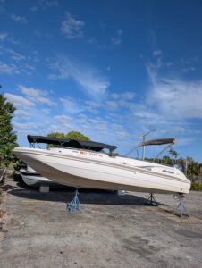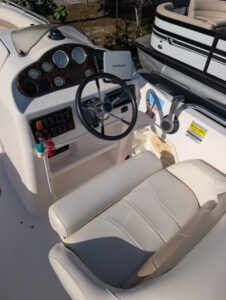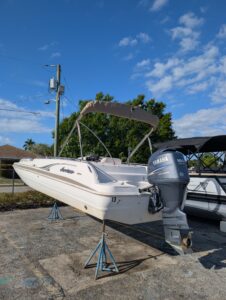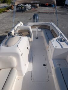 The 2004 Hurricane FunDeck 232 GS is a 23-foot, versatile fiberglass deck boat designed for day cruising, watersports, and fishing. It features an 8'6" beam, a shallow-draft modified-vee hull for stability, and is powered by Yamaha 150 outboards (OB. These boats are known for spacious seating, a capacity for around 12 people, and amenities like bimini tops and changing rooms.