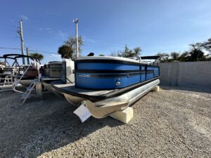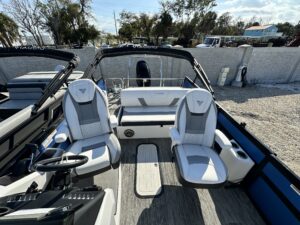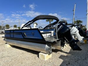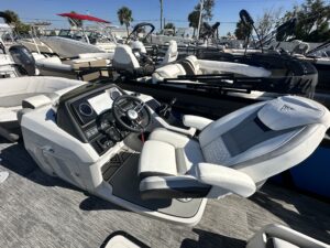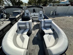 Luxury Amenities: Features include fiberglass helm with windscreen, matte metallic fencing, LCI premium furniture, stainless steel rear ladder, multi-functional gauge cluster, Rockford Fosgate receiver, recliner captain chair, and a floatable rectangle table.
