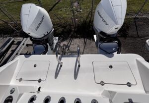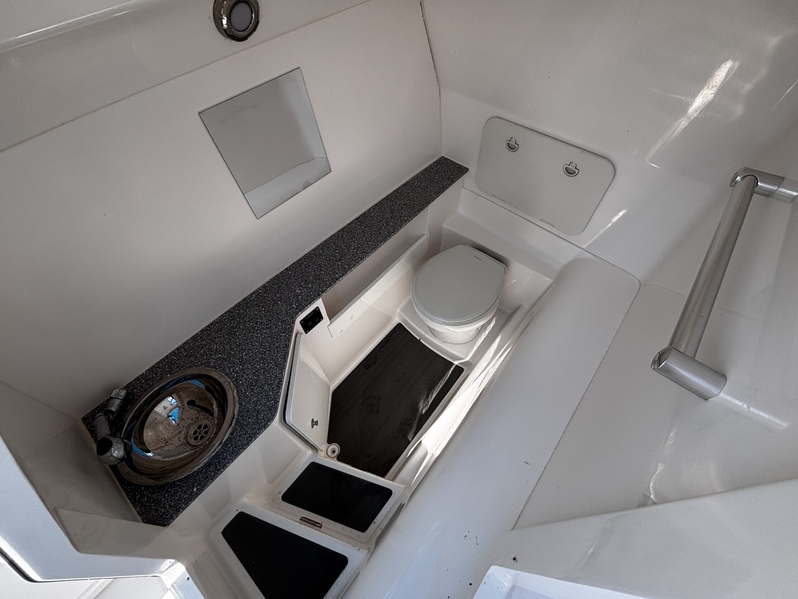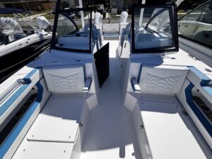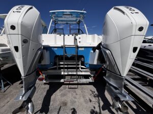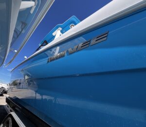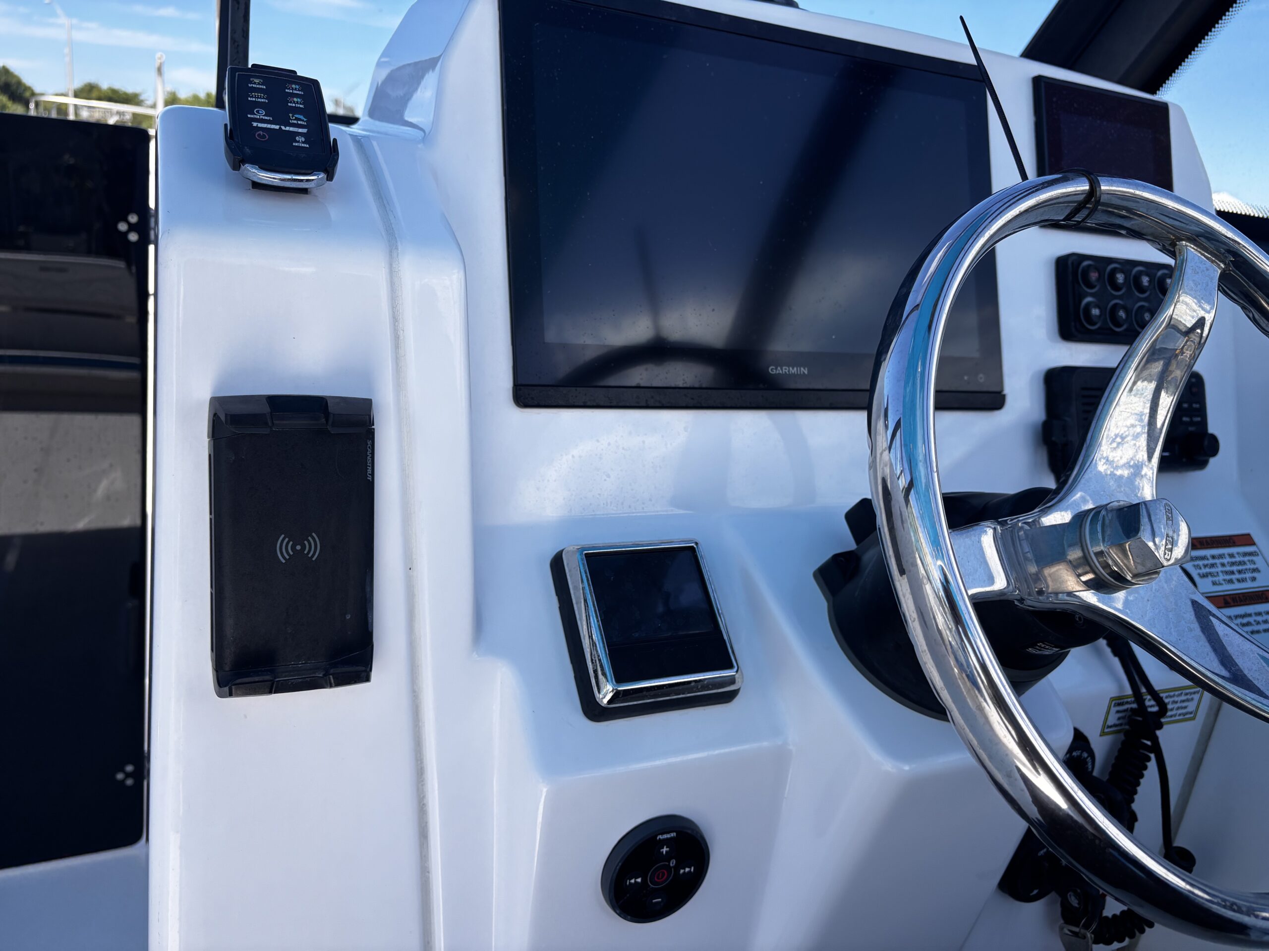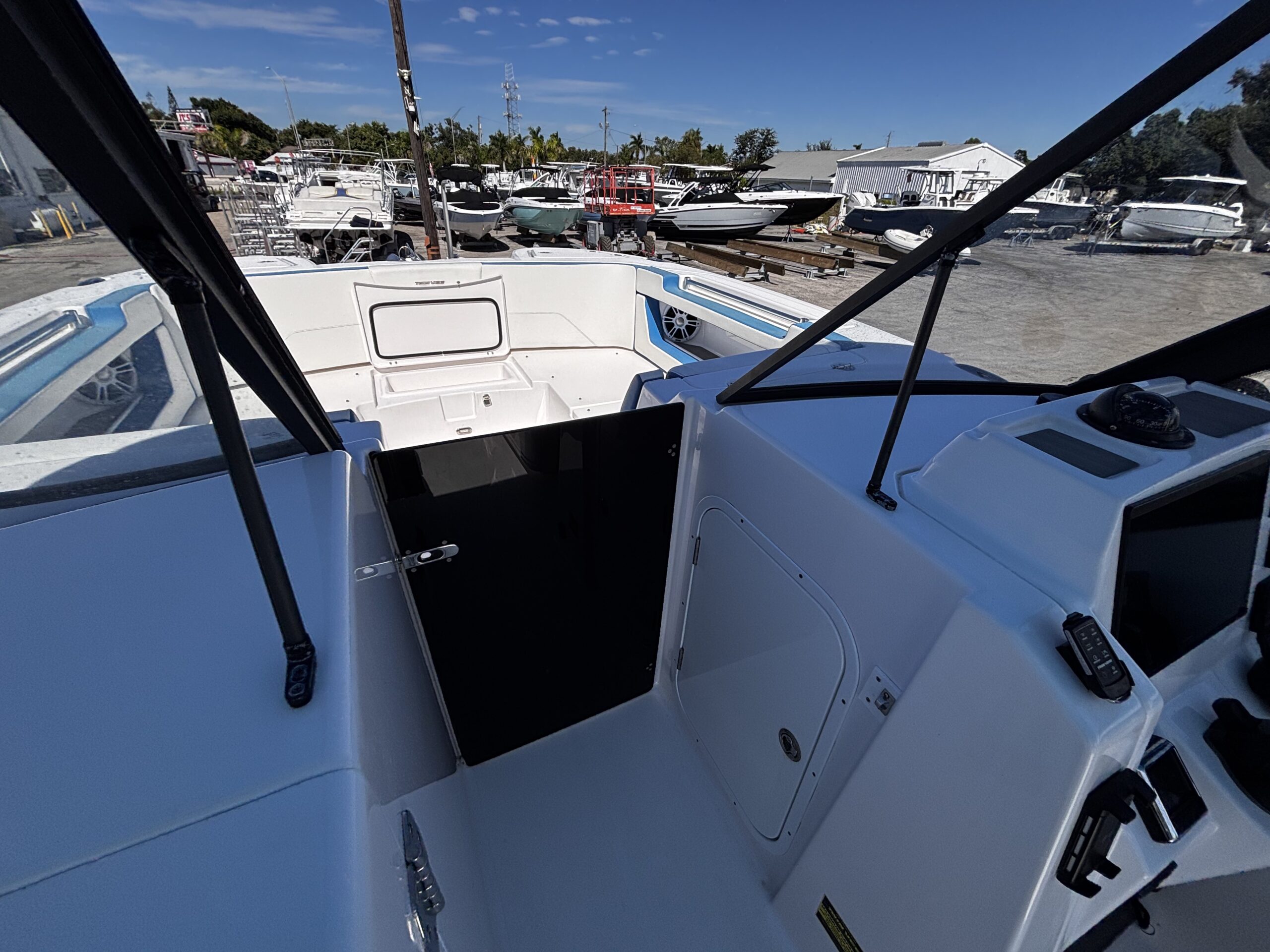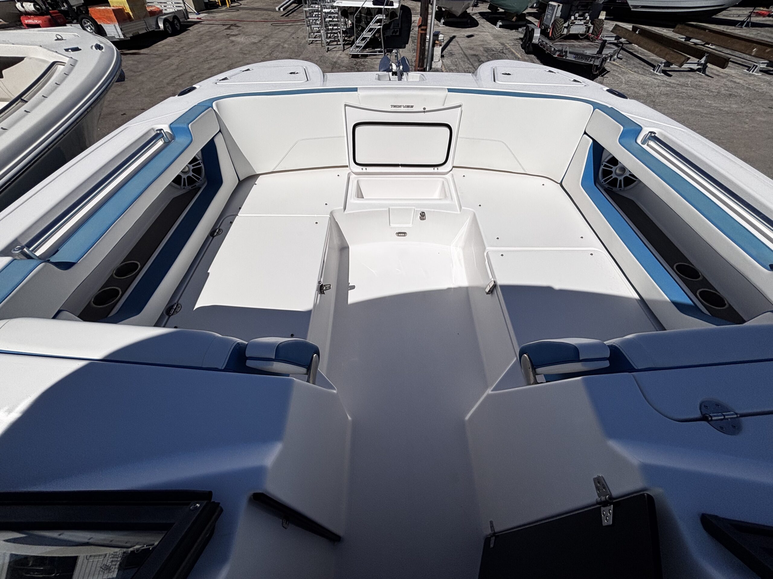 The 2024 Twin Vee 280 GFX is a 28-foot power catamaran, available in both Center Console (CC) and Dual Console (DC) layouts. It's known for its spacious deck, stability, and versatility, making it suitable for various activities like offshore fishing, bay fishing, shallow water fishing, water sports, and family outings. The hull design of Twin Vee's PowerCat hull design provides a smooth and stable ride, reducing drag for improved fuel efficiency. The boat handles well in various conditions, including tight chops and widely spaced oceanic rollers. With only a 20 inch draft, allowing access to shallower waters than many other offshore boats. Widely spaced outboards enable tight turns and precise handling. Abundant storage and rod holders with flush gunwale holders, vertical holders, and rocket launchers on the T-top. Multiple insulated fish boxes, including a large forward console lounger/coffin box. Freshwater and raw water washdowns for cleaning up after fishing. Plush upholstery seating with luxury sport stitch patterns, including bow seating with removable backrests, and fold-away aft seating. The helm station is equipped with captain's chairs, Garmin screens, Suzuki motor integration, chart plotting, LED-backlit switch panel, and more. Options include a tempered glass windshield and redesigned T-top.nHead: Freshwater marine head with macerator in the console. Amenities includes a dive ladder, freshwater shower, raw water washdown, Fusion audio system, LED flood lights, and stainless-steel hardware.