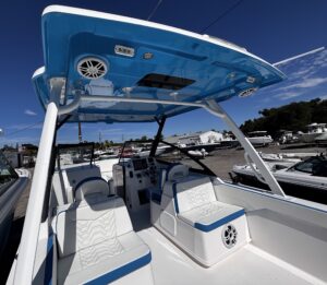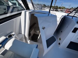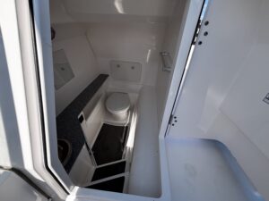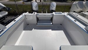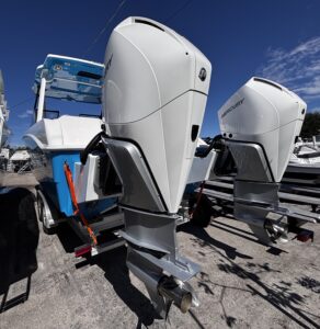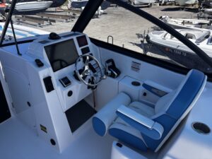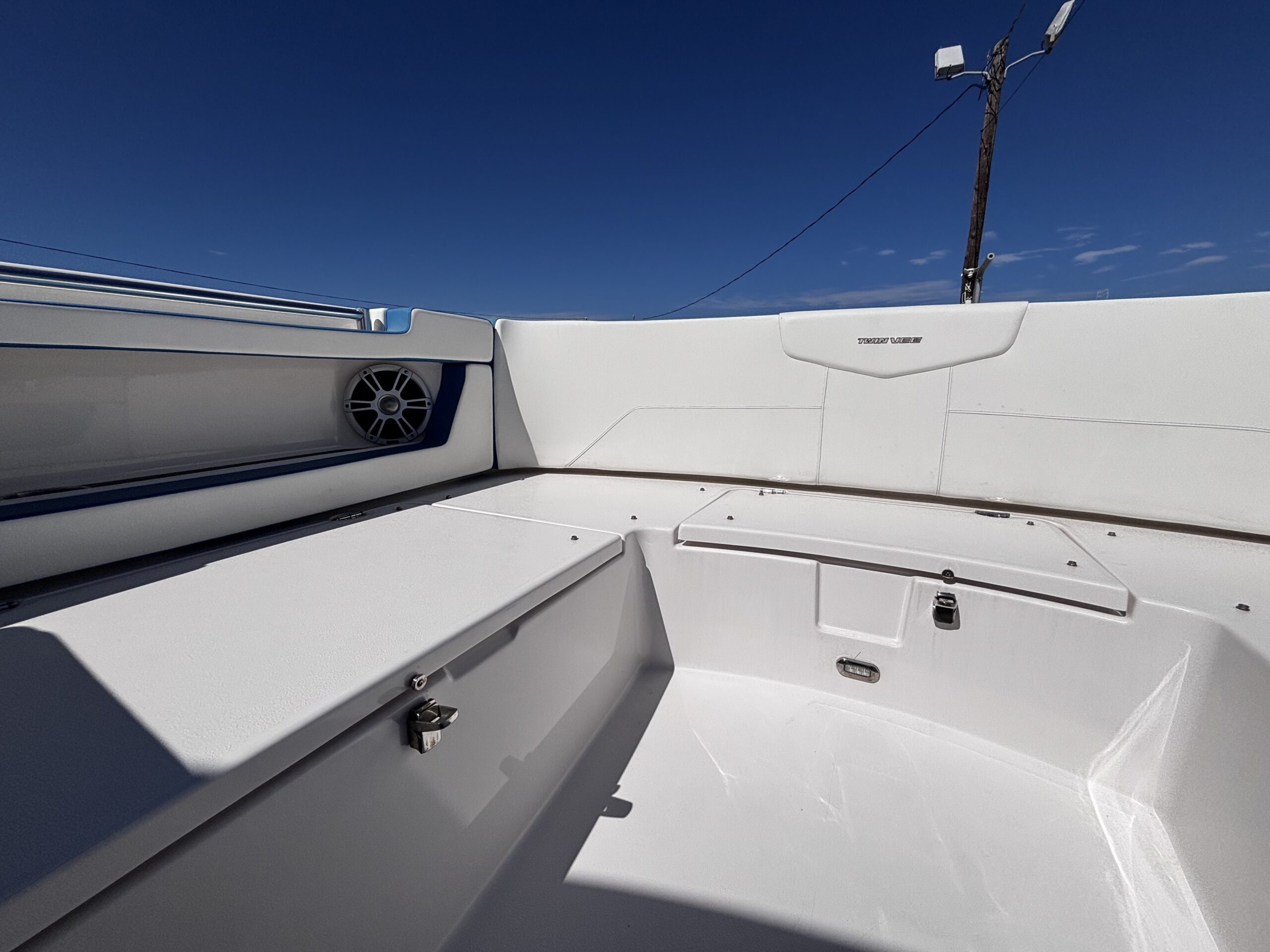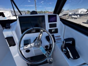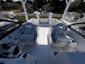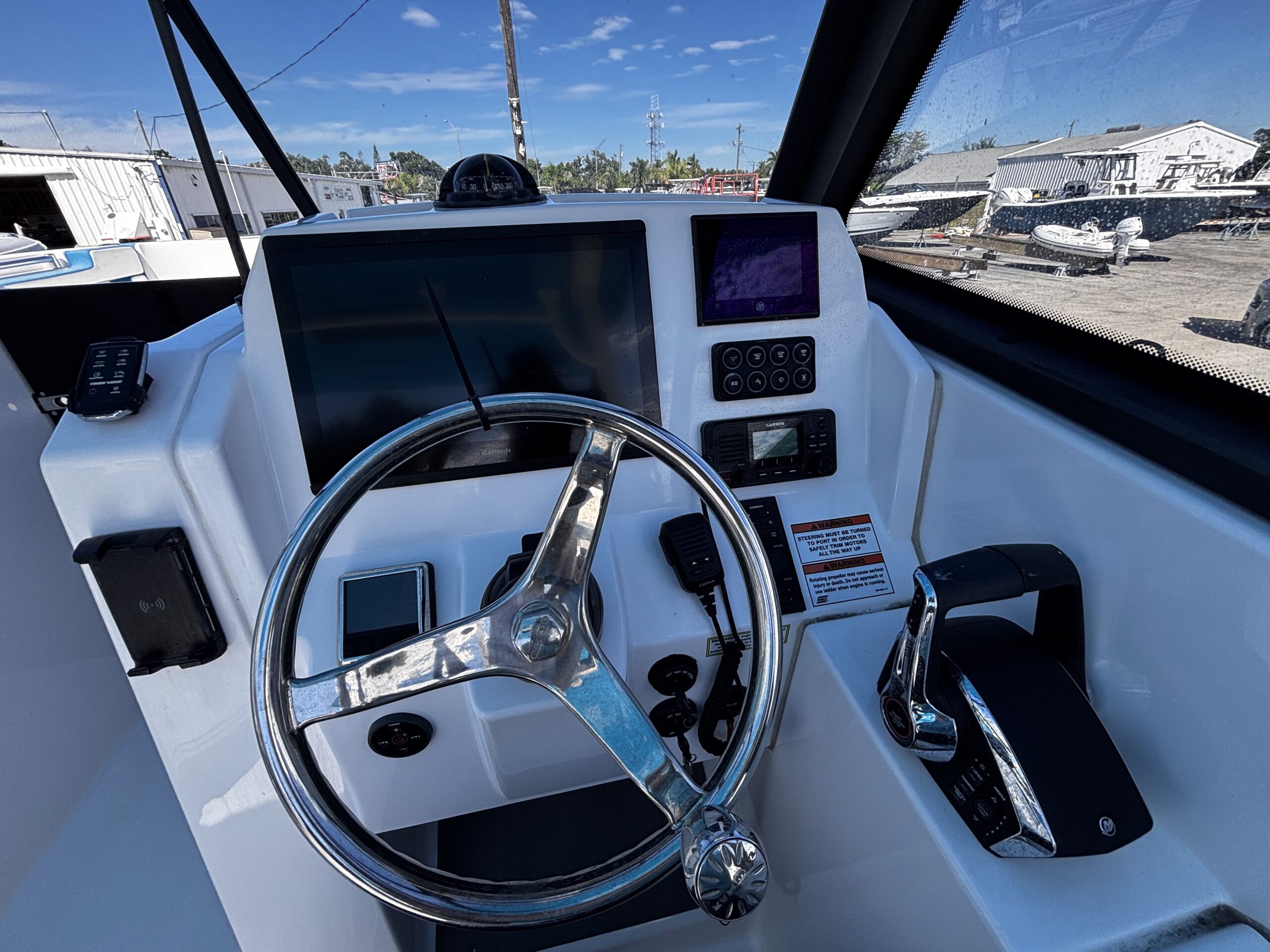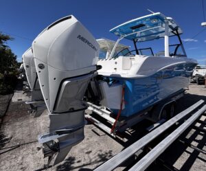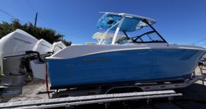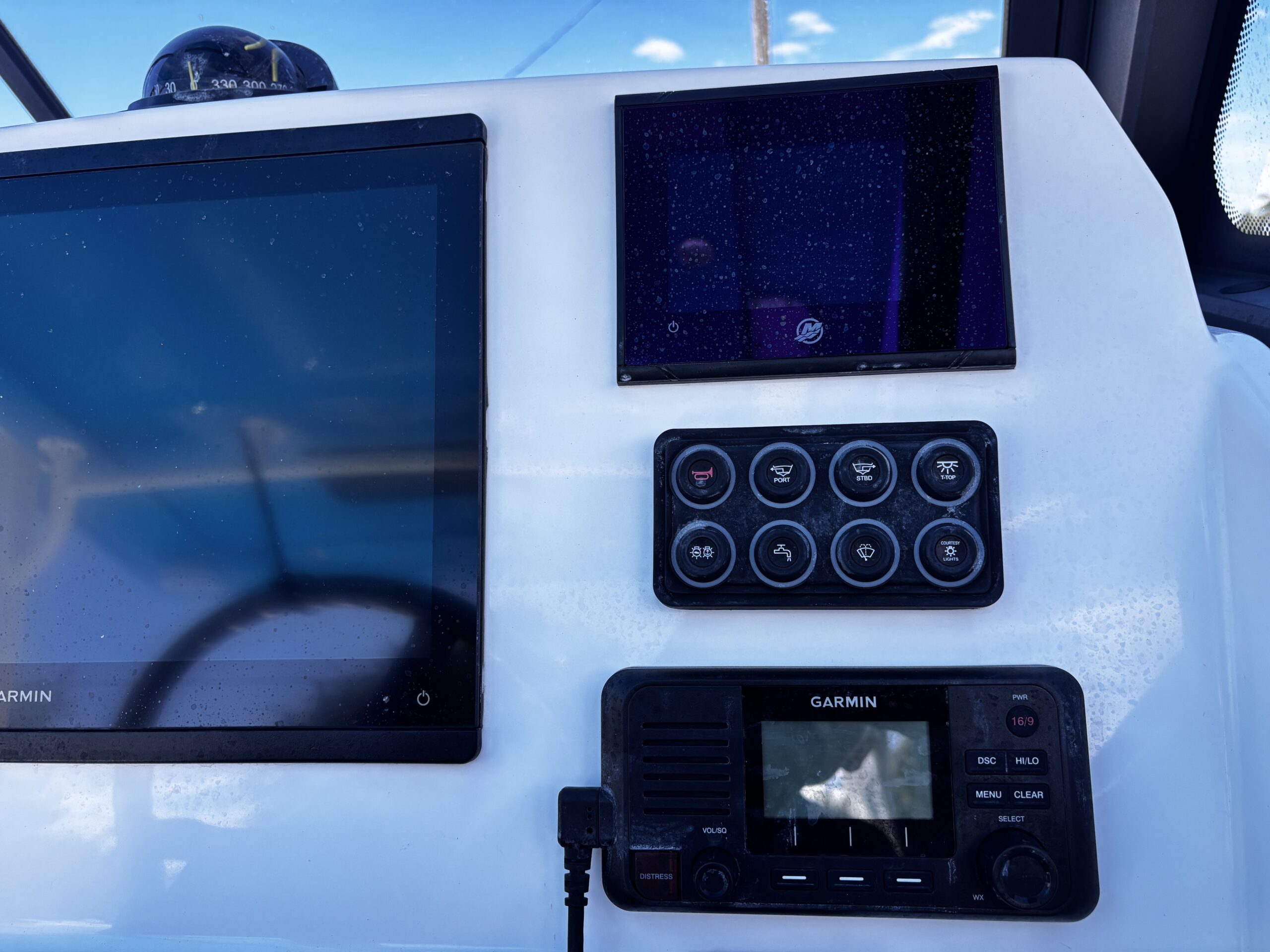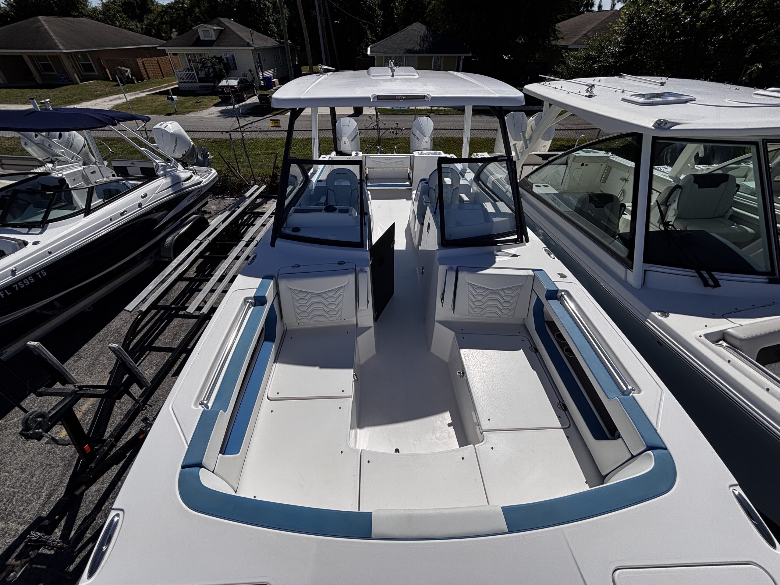 The 2024 Twin Vee 280 GFX is a 28-foot power catamaran, available in both Center Console (CC) and Dual Console (DC) layouts. It's known for its spacious deck, stability, and versatility, making it suitable for various activities like offshore fishing, bay fishing, shallow water fishing, water sports, and family outings. The hull design of Twin Vee's PowerCat hull design provides a smooth and stable ride, reducing drag for improved fuel efficiency. The boat handles well in various conditions, including tight chops and widely spaced oceanic rollers. With only a 20 inch draft, allowing access to shallower waters than many other offshore boats. Widely spaced outboards enable tight turns and precise handling. Abundant storage and rod holders with flush gunwale holders, vertical holders, and rocket launchers on the T-top. Multiple insulated fish boxes, including a large forward console lounger/coffin box. Freshwater and raw water washdowns for cleaning up after fishing. Plush upholstery seating with luxury sport stitch patterns, including bow seating with removable backrests, and fold-away aft seating. The helm station is equipped with captain's chairs, Garmin screens, Suzuki motor integration, chart plotting, LED-backlit switch panel, and more. Options include a tempered glass windshield and redesigned T-top.nHead: Freshwater marine head with macerator in the console. Amenities includes a dive ladder, freshwater shower, raw water washdown, Fusion audio system, LED flood lights, and stainless-steel hardware.