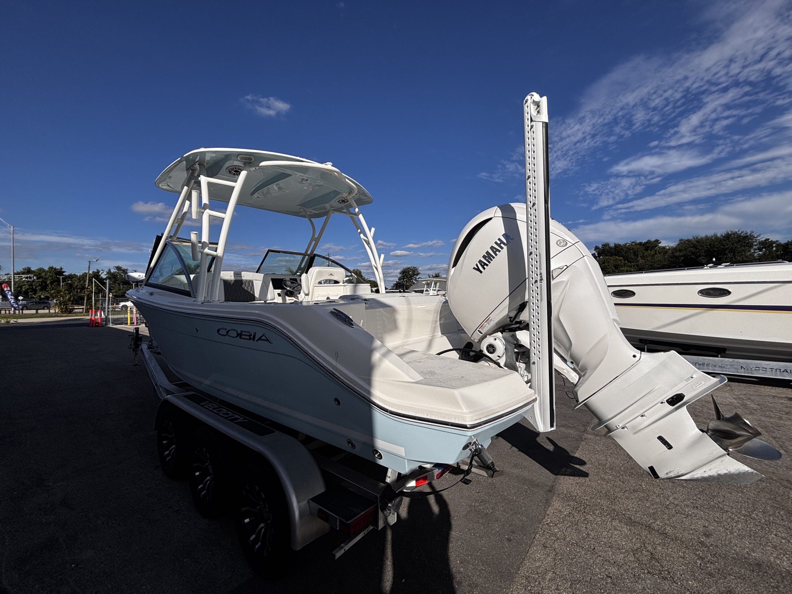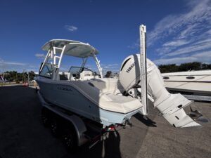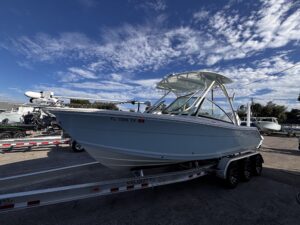 The 2025 Cobia 240 DC is a versatile 25-foot dual-console boat designed for both family cruising and serious fishing. Measuring 25 ft 1 in long with an 8 ft 10 in beam and powered by up to 350 hp, it combines comfort, performance, and practicality. With a 123-gallon fuel capacity and a 21.5u00b0 deadrise hull, it offers solid handling in varied conditions while remaining easy to trailer. The layout features plush seating for up to nine passengers, a walk-through bow, a convertible lounge, and a hideaway aft bench, making it ideal for relaxing or entertaining. Anglers will appreciate the dual in-floor 24-gallon fish boxes, 22-gallon livewell, rod holders, and bait prep station, while families will enjoy conveniences such as a walk-down head with sink, USB ports, and freshwater washdown. Available with premium options like a hardtop, Garmin electronics, and digital steering, the 240 DC is equally suited for offshore adventures or leisurely day trips. Overall, itu2019s a well-balanced, high-quality boat that offers comfort, capability, and craftsmanship in a manageable size.