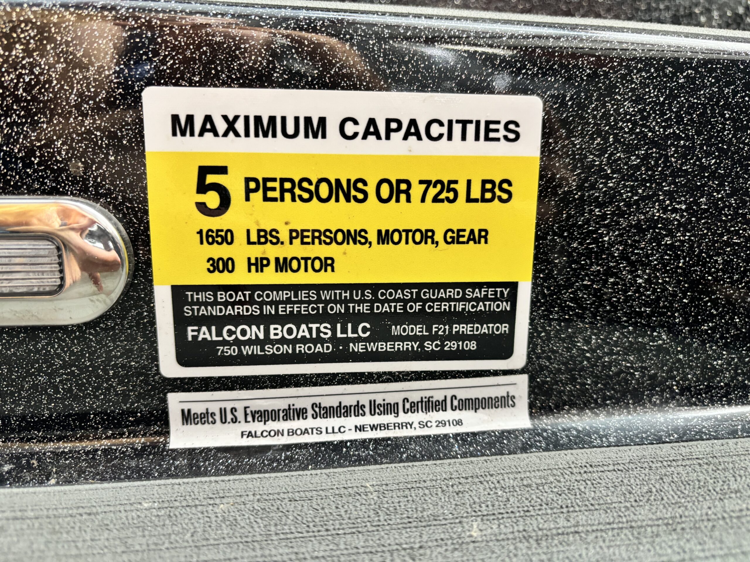 Experience next-level bass fishing in the 2025 Falcon 21 Predator, a powerhouse designed to deliver elite-level performance, stability, and fishability. With its sleek 21-foot frame and broad 99u201d beam, this boat offers unmatched deck space and balance, paired with the muscle to handle up to 250HP for serious speed and control. The intelligently laid-out cockpit includes oversized storage compartments, dual livewells, and dedicated rod storage, making gear access effortless during intense tournament runs. Built with precision and durability in mind, itu2019s ready for advanced electronics, shallow water anchors, and lithium power setups. Whether youu2019re chasing trophies or cruising your local waters, the 21 Predator stands out with its smooth ride, competitive edge, and unmistakable Falcon quality.